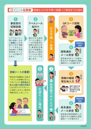 認知症などにより行方不明となるおそれのある高齢者などに事前登録いただき、日頃の見守りや行方不明となった場合に早期発見できるよう関係機関などと情報共有・連携し、生命および身体の安全とその家族などの精神的負担軽減を図るための事業です。